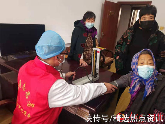 乐亭县马头营镇新时代文明实践所志愿者为村民免费测量血压。 李彦婷摄