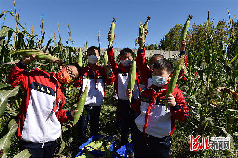 9月23日,在衡水市农业科学研究院耕读科普基地,学生们开心地展示亲手采摘的玉米。河北日报记者焦磊摄